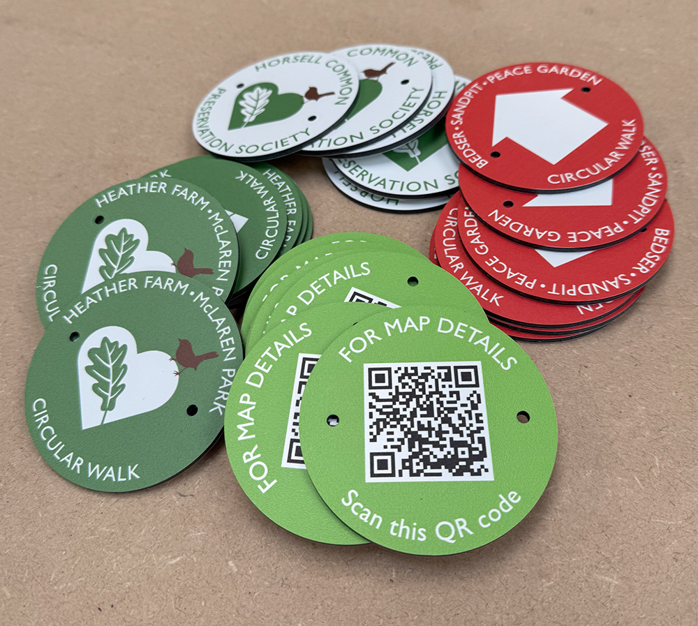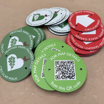 For exposed environments where durability is paramount, GRP (fiberglass) offers an excellent option. Foamex is a cost-effective material that can also be directly printed. Additionally, QR codes can be incorporated into all materials mentioned above. We also offer laser-etched stainless steel plaques, discs, or panels produced using our in-house CO2 laser equipment.