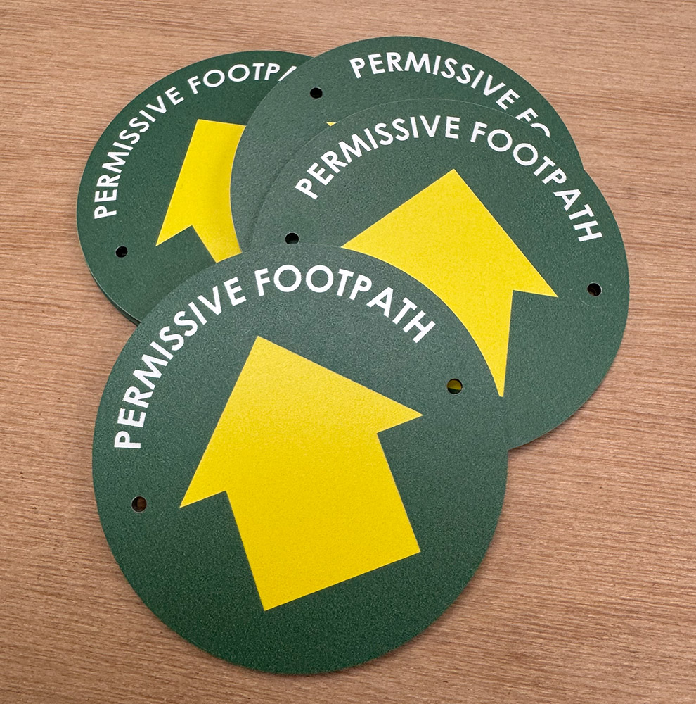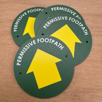 Waymarker discs are available in a variety of materials, shapes, and sizes to meet diverse requirements, ranging from standard 76mm circular designs to square and bespoke cut-out shapes. ACM (Dibond) is the most popular material chosen, featuring full-color direct printing or adhesive vinyl with an anti-graffiti film on the surface. These discs come with either two or three pre-drilled holes and provide a long-lasting solution.